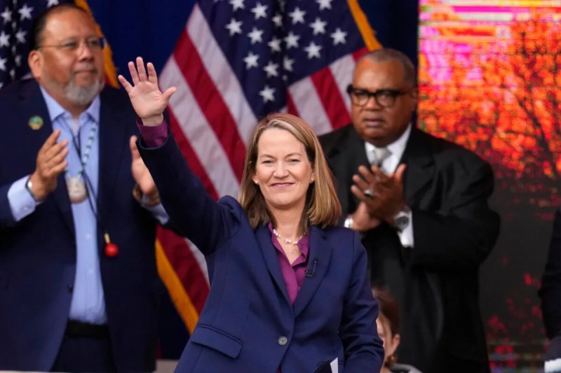 The new Arizona Attorney General Kris Mayes, a Democrat, waves to the crowd after taking the ceremonial oath of office during a public ceremonial inauguration at the state Capitol in Phoenix, Thursday, Jan. 5, 2023. (AP Photo/Ross D. Franklin)