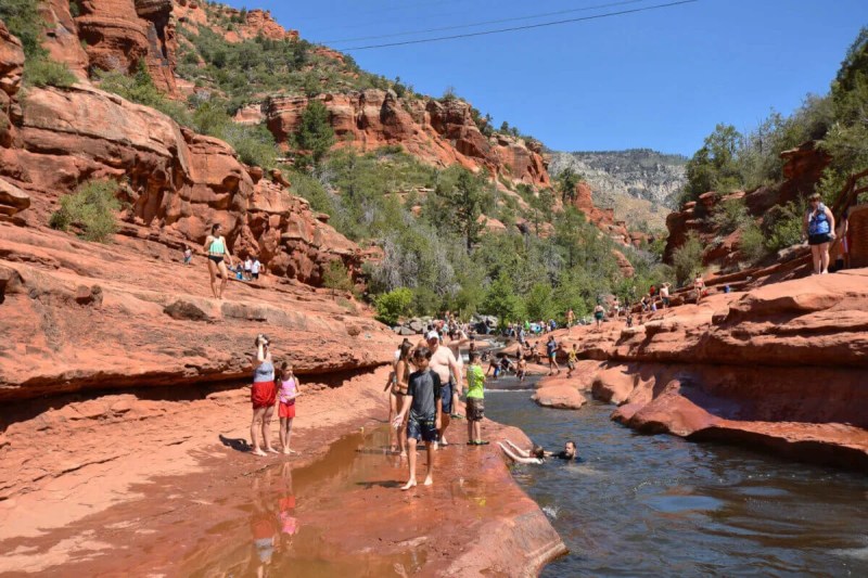 Sedona’s Slide Rock State Park is named for the natural red rock formation that forms a … you guessed it … 80-foot slide that visitors can ride down when they’re cooling off in Oak Creek. The state park is located on a 43-acre historic apple farm with almost 300 apple trees. You’ll see the historic cabins near the start of a trail that you’ll need to follow down to the main swimming area. When you’re there, enjoy the red rock views along with plenty of places to take a dip.