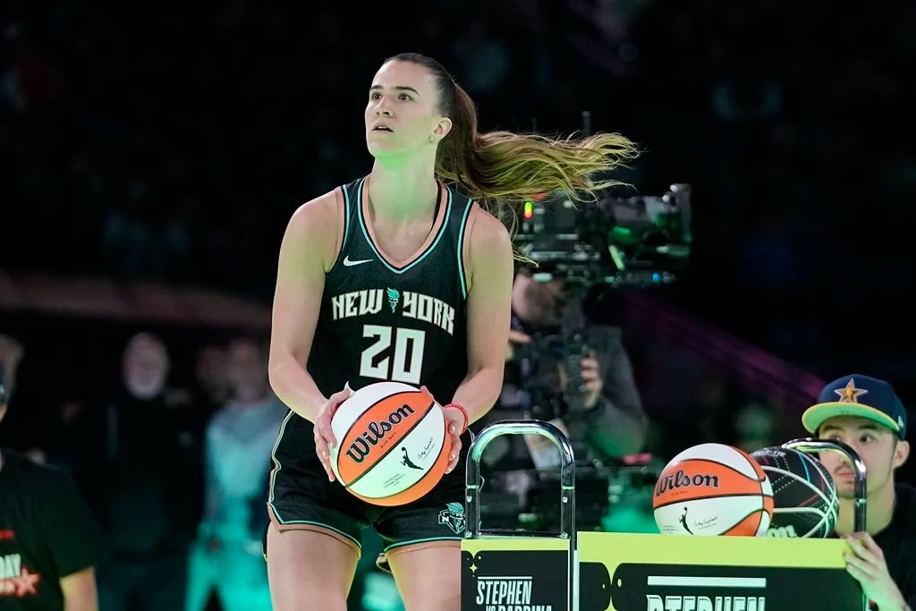 New York Liberty guard Sabrina Ionescu shoots during a competition against Golden State Warriors’ Stephen Curry at the NBA basketball All-Star weekend, Saturday, Feb. 17, 2024, in Indianapolis. (AP Photo/Darron Cummings)