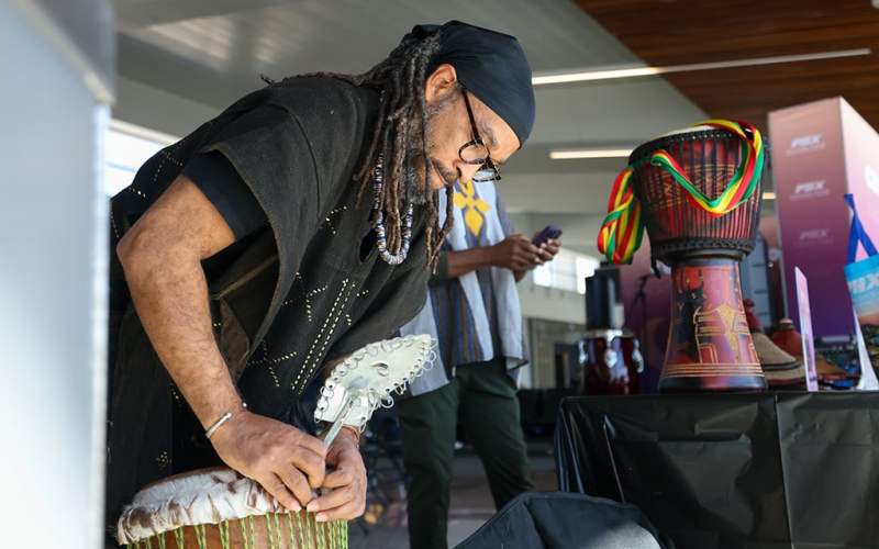 Jumoke’ Farrow sets up his hand drum during the Black History Month edition of the Culture Corner at Phoenix Sky Harbor International Airport in Terminal 3 on Feb. 10, 2025. Between gates F3 and F4, passersby can immerse themselves in various cultures while waiting to board or arriving to Phoenix. (Photo by Alexis Heichman/Cronkite News)