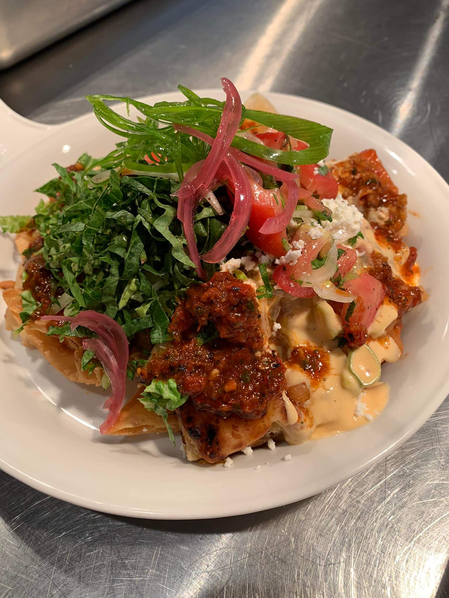 Bundi’tunneh and corn chip nachos overflowing with chorizo chili beans, cheezy weezy sauce, red chili salsa, and pico de Gallo. Photo courtesy Café Gozhóó’s Facebook.