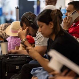 Air travelers became the face of the widespread technology outage Friday as they posted pictures on social media of crowds of people stranded at airports in Europe and the United States.