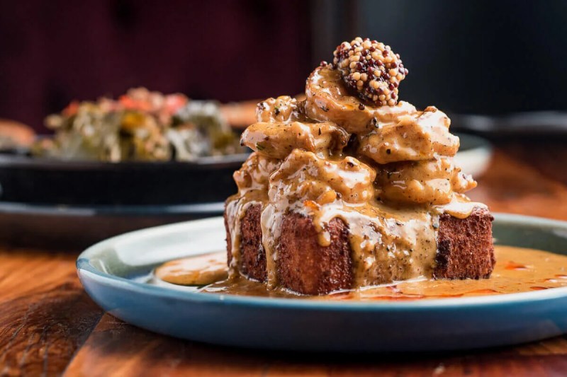 You may not think of hot dogs as must-try dishes, but the iconic Sonoran dog is unlike any you’ve had before. Served in a slightly sweet Mexican bolillo roll, it comprises a bacon-wrapped wiener, pinto beans, onions, tomato, mustard, mayonnaise and jalapeno sauce. This unique—and tasty—recipe has garnered widespread fame. In 2018, the James Beard Foundation honored the humble eatery, painted in the red, white and green of the Mexican flag, with its America’s Classics award, which honors restaurants that serve “quality food that reflects the character of their community.” Try your dog Sammy style: two bacon-wrapped franks in a single roll.