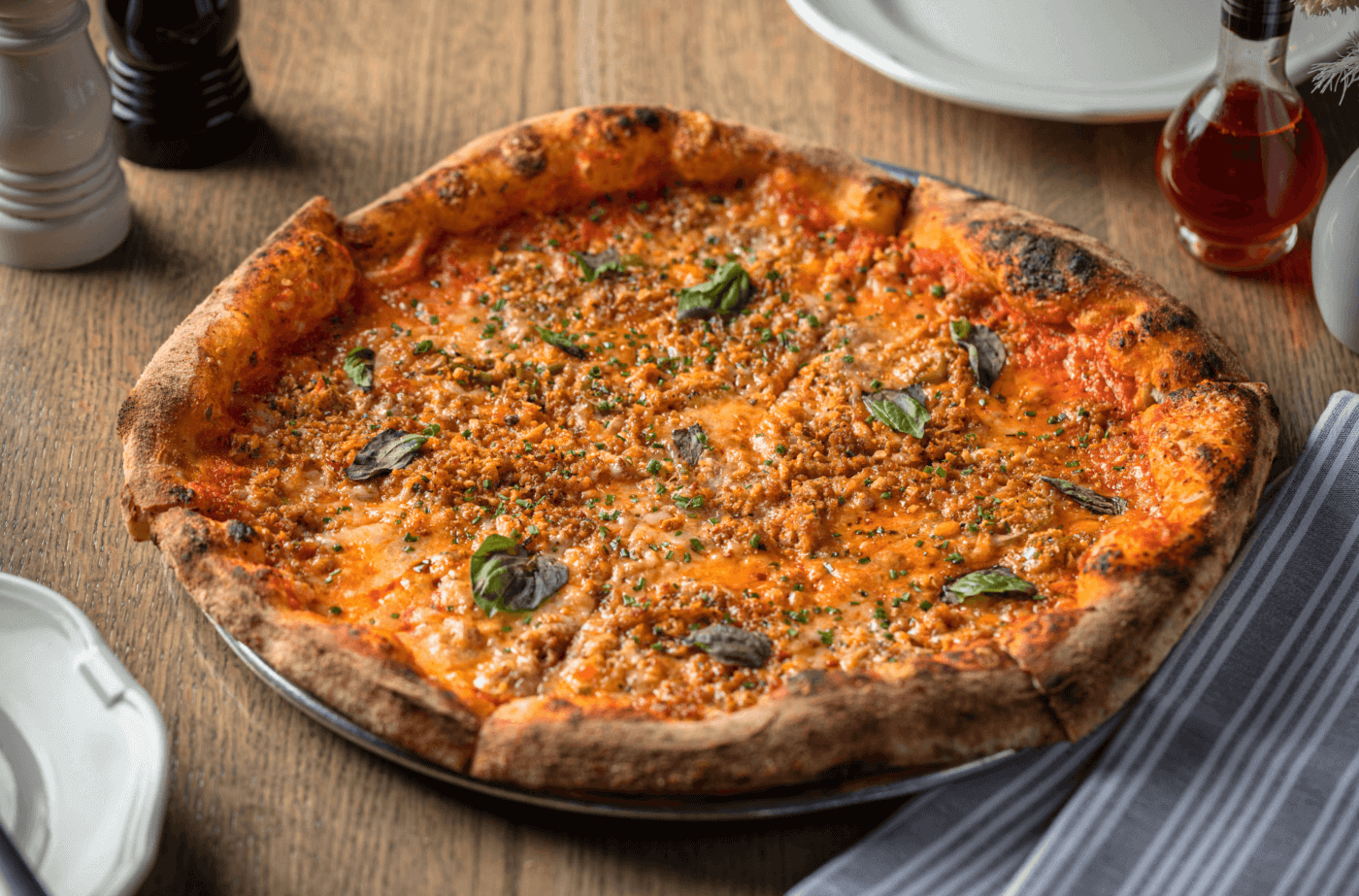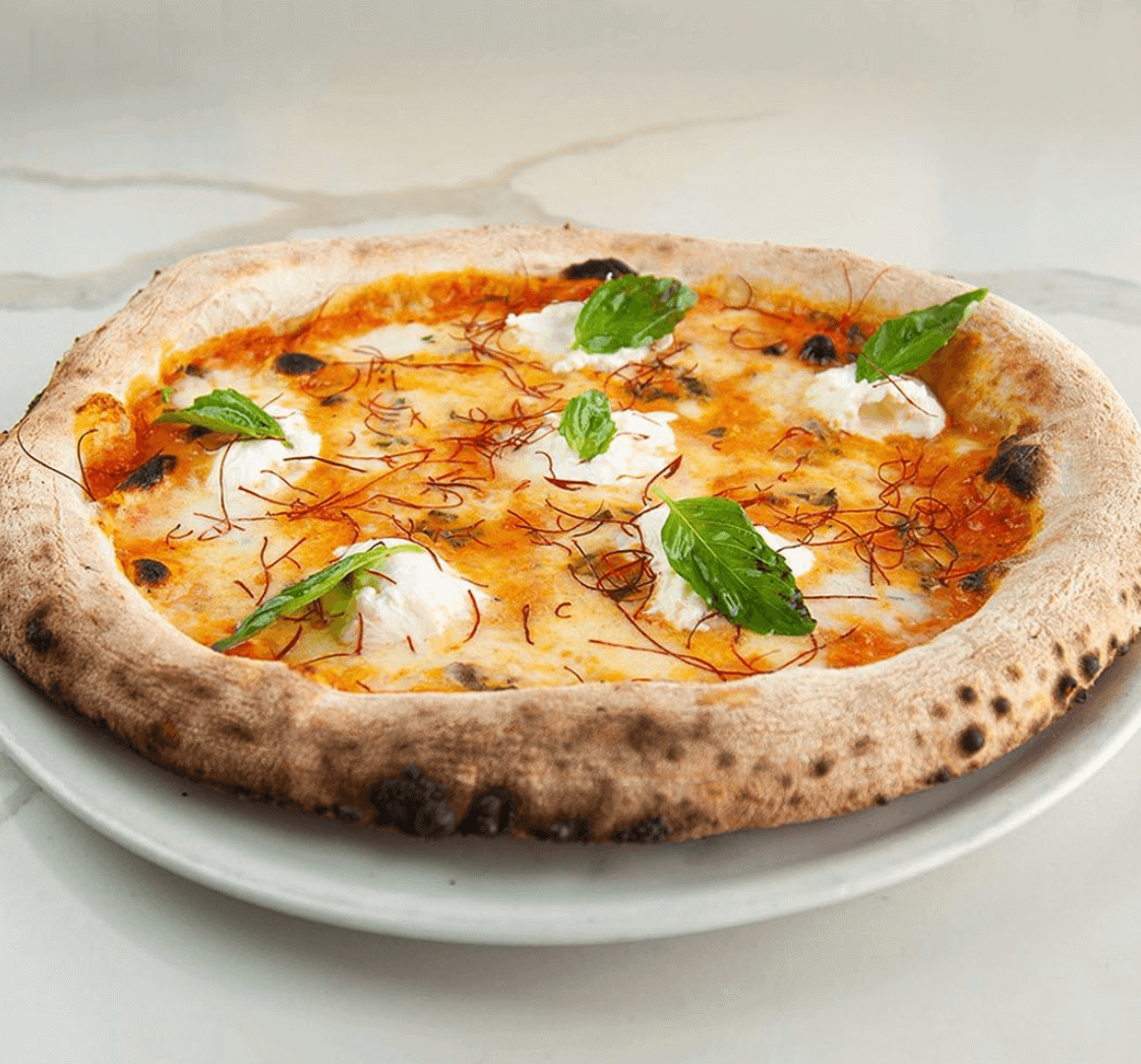 Pies are cooked for 60 to 90 seconds until the pizza has a soft center and a blistered crust. For a $2 to $3 extra fee, pizzas can be ordered vegan and gluten-free.