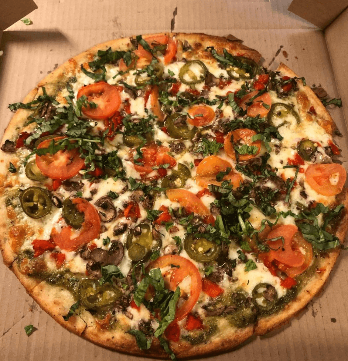 For a vegetarian pie, the veg out is topped with mushrooms, red onion, black olives, mixed bell peppers, and mozzarella.