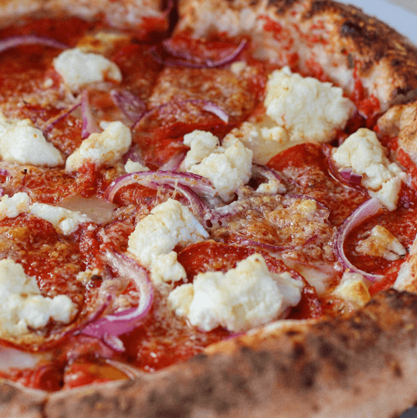 Pizzeria Virtu serves nine pies. One dynamic choice is the calabrese—a pie topped with tomato, caciocavallo, spicy sopressata, ricotta, red onion, and honey.