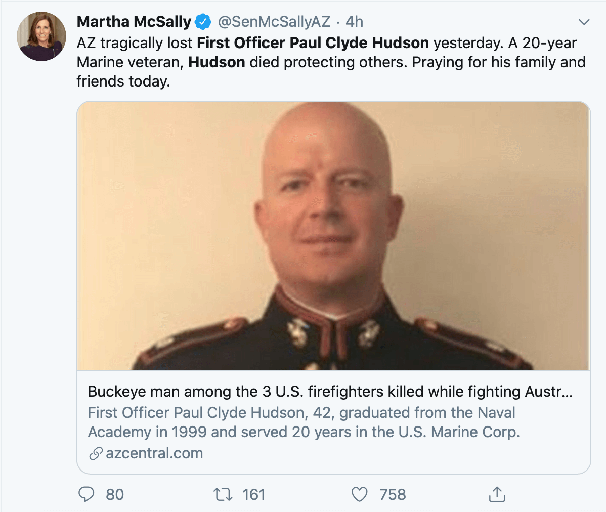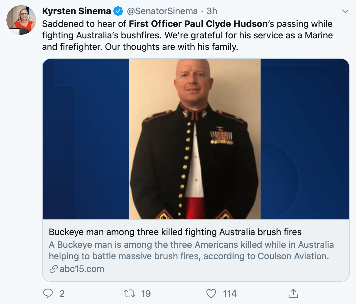 “First Officer Paul Hudson was a hero who represented Arizona’s very best,” said Governor Ducey. “A graduate of the Naval Academy, First Officer Hudson served 20 years in the United States Marine Corps before becoming a firefighter. Then, when duty called again, First Officer Hudson didn’t hesitate, putting his life on the line to help others battling wildfires in Australia. My sincere condolences go out to First Officer Hudson’s family and loved ones. And our prayers are with them and all Arizona’s firefighters providing aid in Australia.