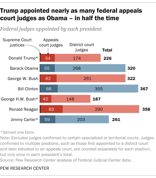 During his four-year term, Trump appointed three Supreme Court justices (compared to just two during former President Barack Obama’s eight years), 54 appeals court justices (Obama only appointed 55), and 174 district court judges (268 for Obama). More than a quarter of currently active federal judges are Trump appointees.