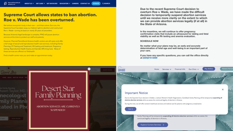This photo illustration shows the websites of several Arizona abortion providers after the US Supreme Court overturned Roe v. Wade. Planned Parenthood Arizona and other clinics ceased abortion procedures once the decision was announced. (Photo illustration by Troy Hill/Cronkite News)