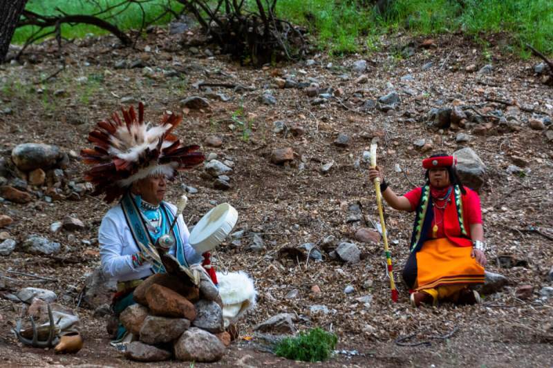 Her brother, Uqualla — who goes by a single name — sat with a drum before a fire pit and next to a set of antlers holding a water-filled gourd, preparing to conduct the ceremony.
