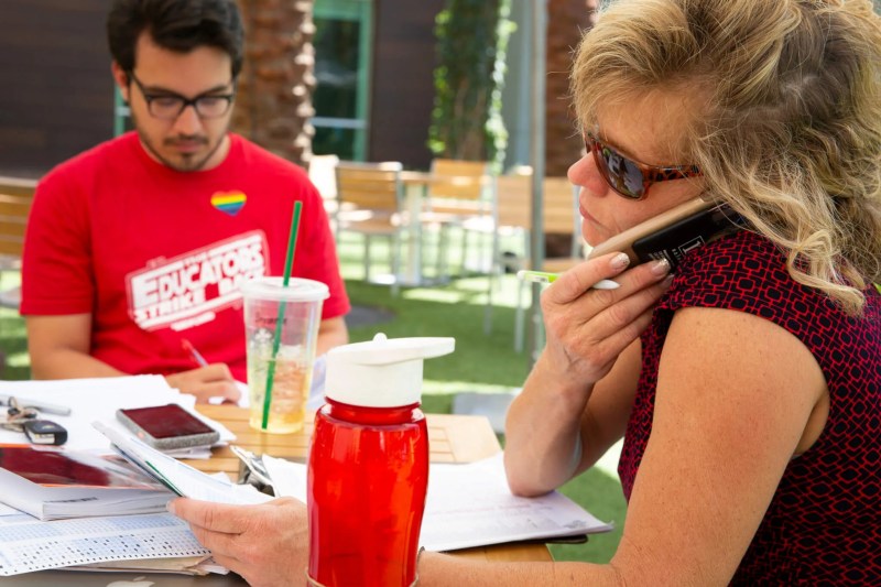Christine Marsh answers a campaign phone call while she records grades from her English students in between campaign events at a "grade-in" with her fellow striking teacher Karson Shipp to demonstrate that they're still working in the interest of their students during the educators strike for public education funding on April 28 at Desert Ridge Marketplace in Phoenix, Ariz.