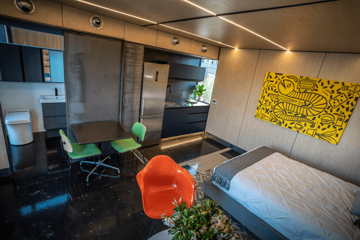 The shipping container homes—which can be heated and cooled—come in two models: a studio with no bathroom, and an accessible one-bedroom, one-bathroom container. They are solar-powered during the day, lithium battery-powered at night, and don’t need to be connected to utilities.