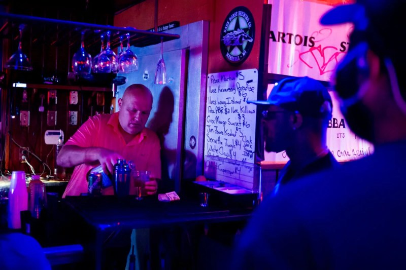 In this June 8, 2020, file photo, Rodney Ott, owner of The Loft, makes mixed drinks from behind the bar for patrons as he reopens fully for the first time amid the coronavirus outbreak in downtown Flint, Mich.