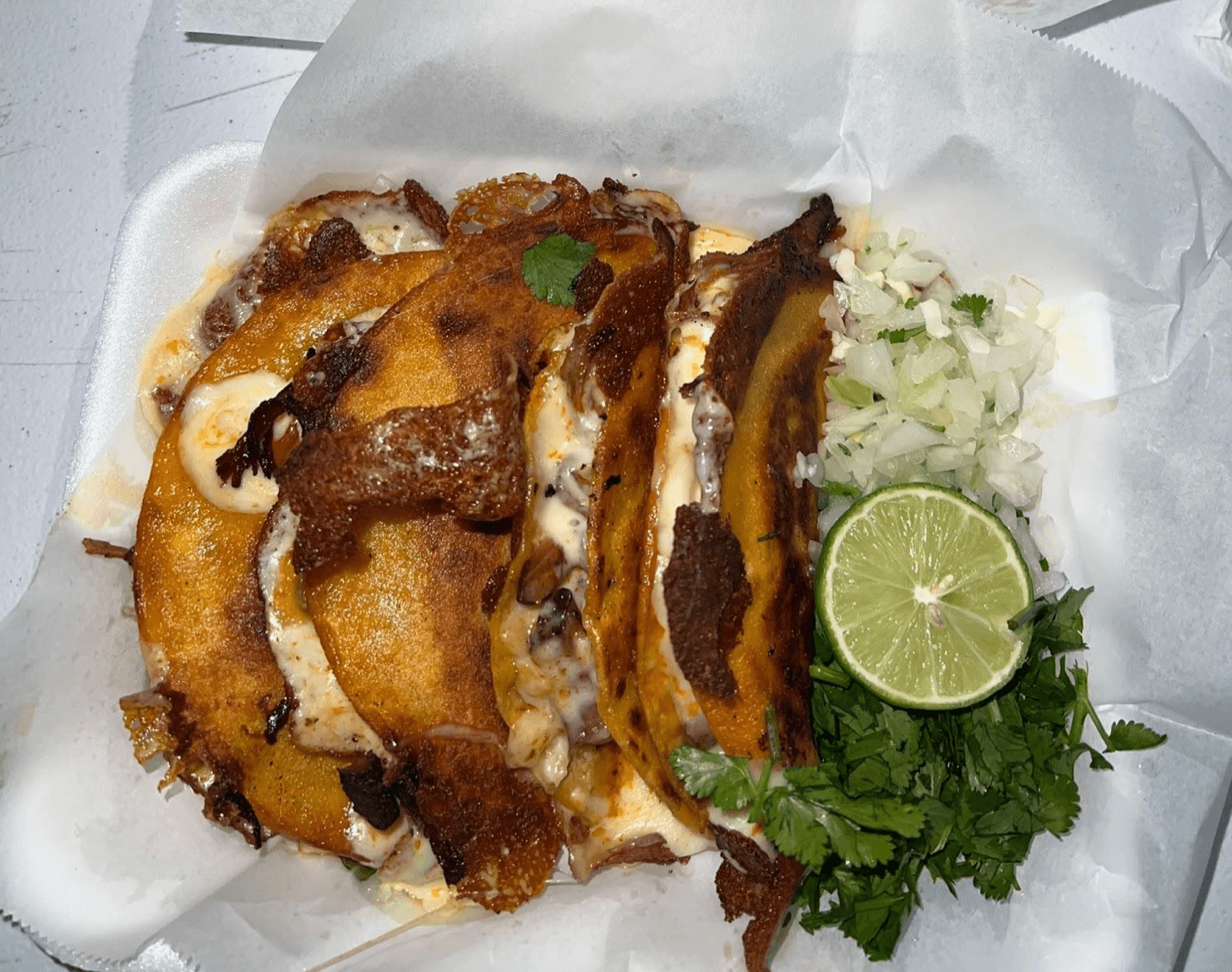 Tacos Tapatio makes tacos, burritos, quesadillas, and Tapatio fries with meats like birria (shredded beef), al pastor (pork), carne asada (steak), shrimp, and pollo (chicken) to choose from. But that’s just the basics: like their location, Tacos Tapatio changes their menu by the day–hungry patrons are encouraged to check out an updated menu on their Instagram page to see what is available.