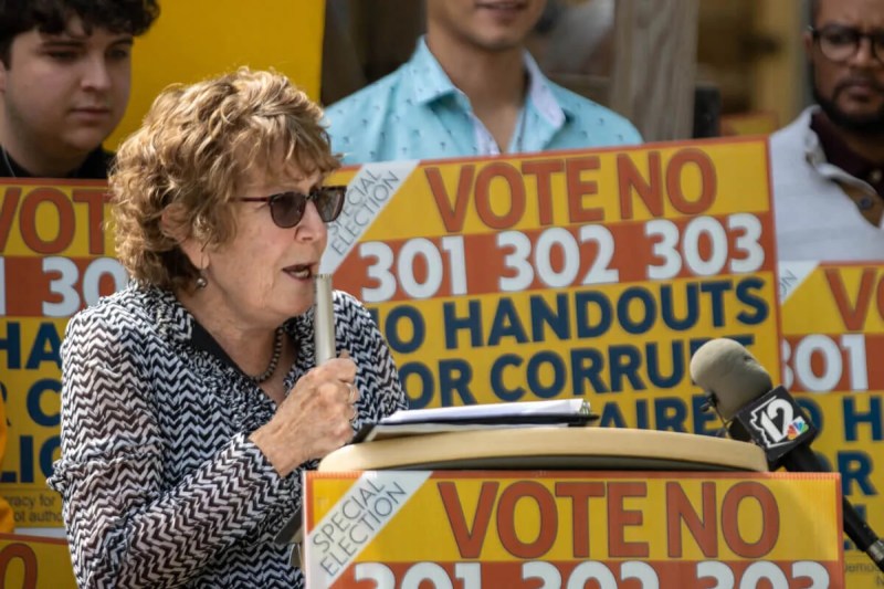 Gayle Shanks, co-owner of Changing Hands Bookstore in Tempe, speaks against special ballot propositions 301, 302 and 303 on March 20, 2023, in Tempe. The propositions will appear on a special election ballot in May in Tempe and, if passed, would make the Arizona Coyotes arena and entertainment district possible. (Photo by Drake Presto/Cronkite News)