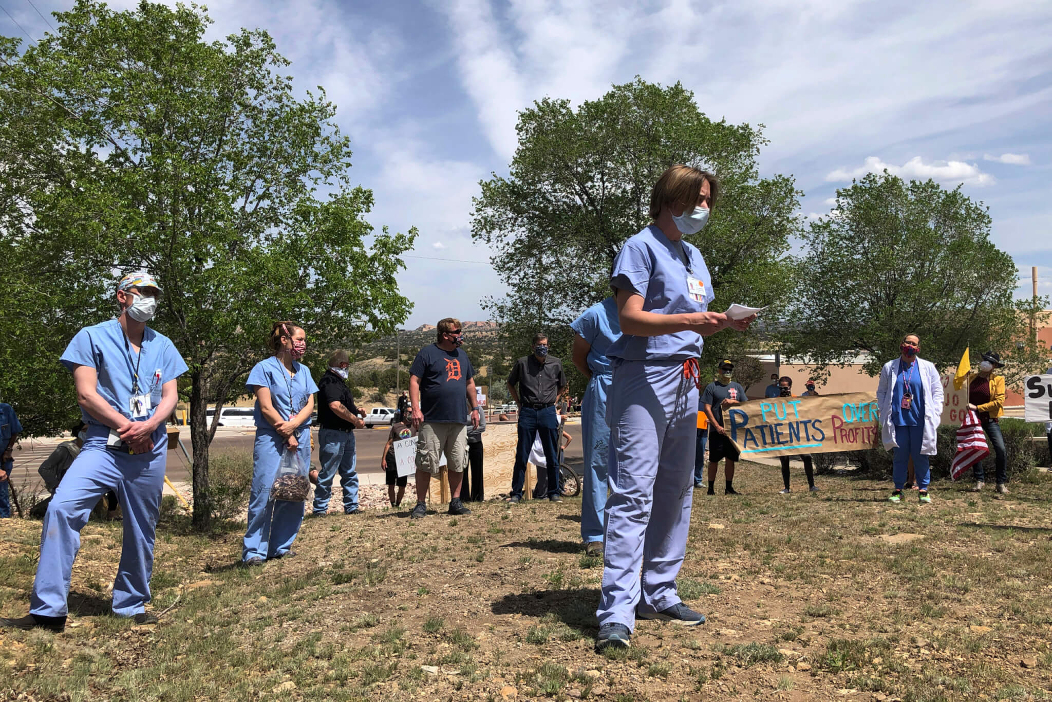 In this photo taken May 8, 2020, medical staff from Rehoboth McKinley Christian Hospital hold a protest over working conditions and depleted staff in Gallup, N.M. Many nurses and doctors say staffing at the hospital was inadequate because of hospital CEO David Conejo's move to cut back on nurses in the first week of March to offset declining hospital revenues after elective surgeries were suspended. They voiced their discontent at the recent protest calling for his resignation. (AP Photo/Morgan Lee)
