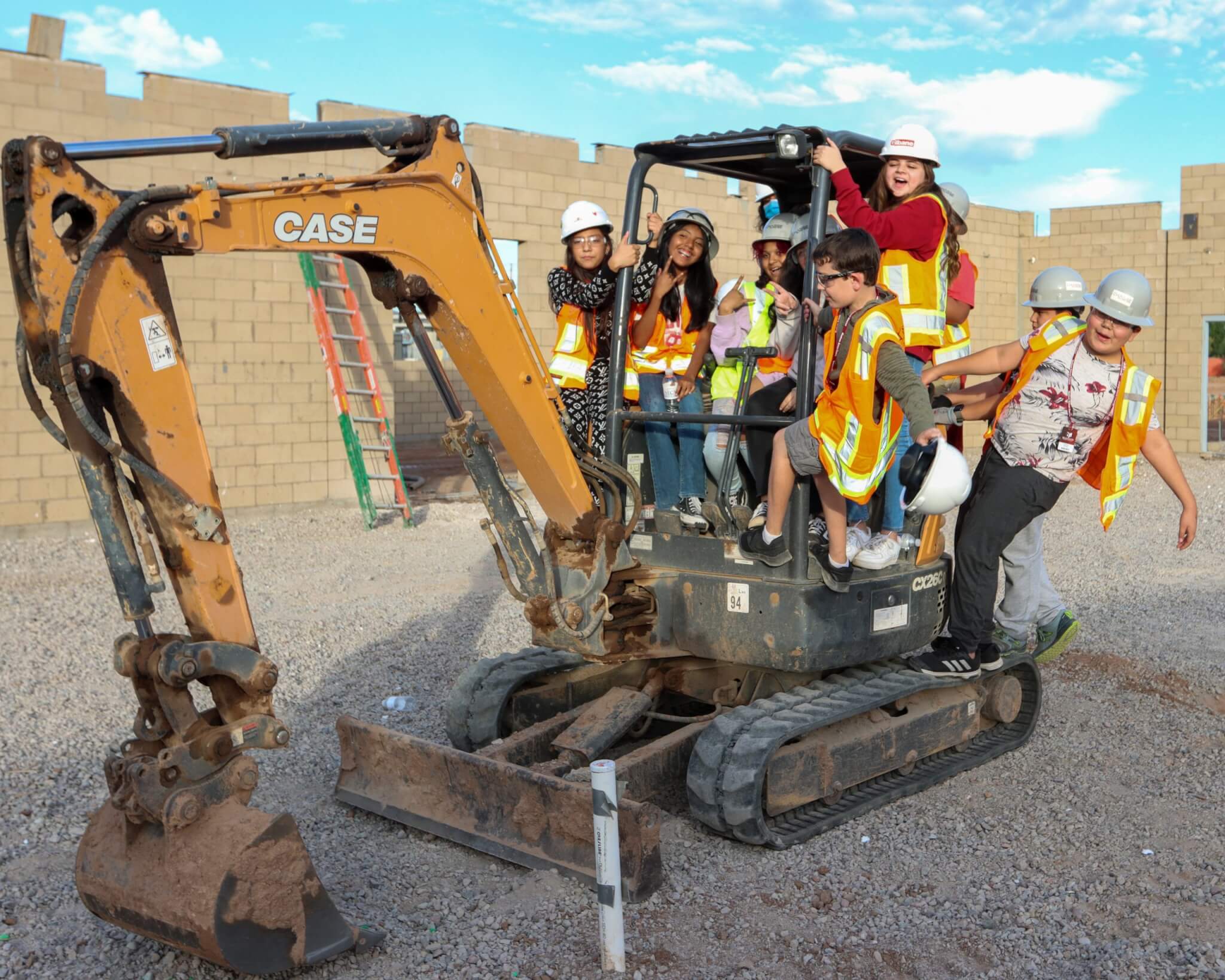 TradeUp! students climb on a mini excavator – while it’s turned off – to see what the buttons and switches do. Photo taken Nov. 1, 2022, at Madison Park Middle School in Phoenix. (Photo by Justin Spangenthal/Cronkite News)