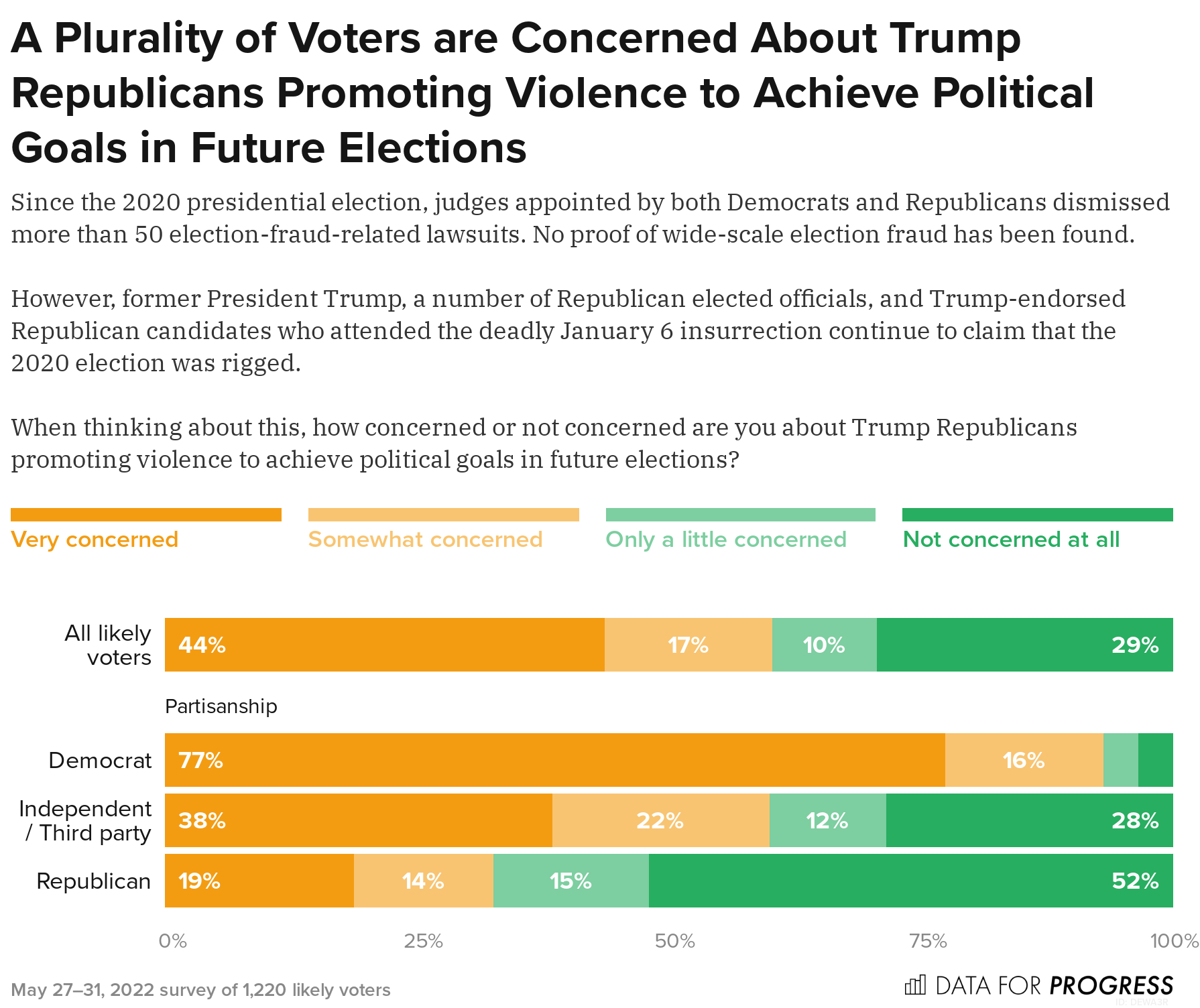 A new Courier Newsroom/Data for Progress poll finds that 61% of likely voters are “very” or “somewhat” concerned that Trump Republicans will promote violence to achieve political goals in future elections. Another 10% are a “little concerned” about the possibility. Only 29% of voters say they’re not concerned at all.