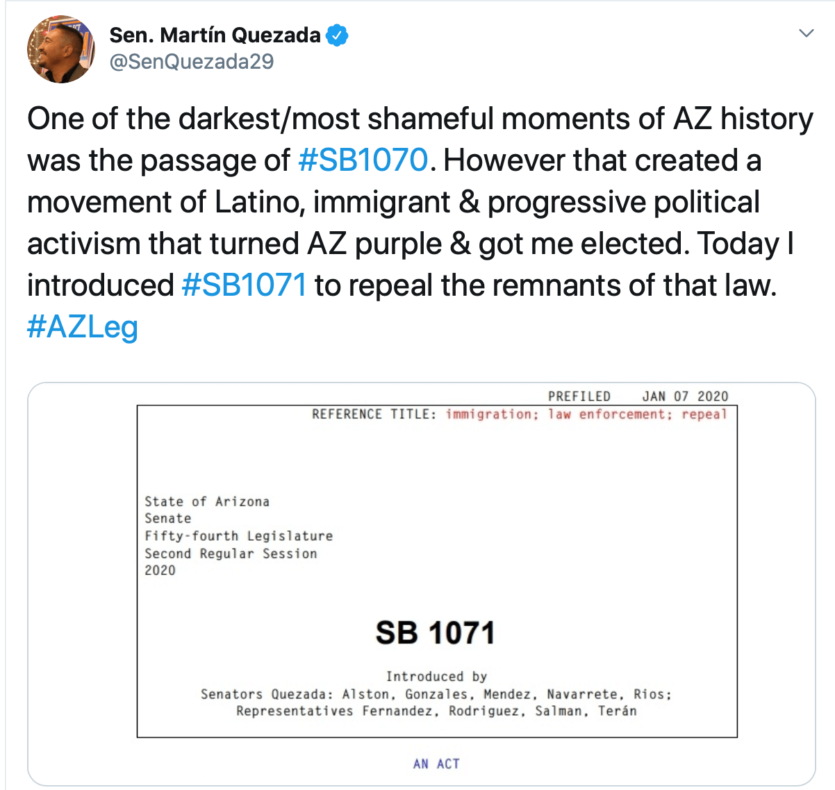 On Tuesday, Quezada tweeted, “ One of the darkest/most shameful moments of AZ history was the passage of #SB1070. However that created a movement of Latino, immigrant & progressive political activism that turned AZ purple & got me elected. Today I introduced #SB1071 to repeal the remnants of that law.”
