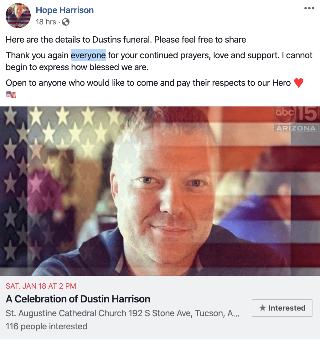 In a social media post, Harrison’s wife Hope wrote, “Thank you again everyone for your continued prayers, love and support. I cannot begin to express how blessed we are. Open to anyone who would like to come and pay their respects to our Hero.”